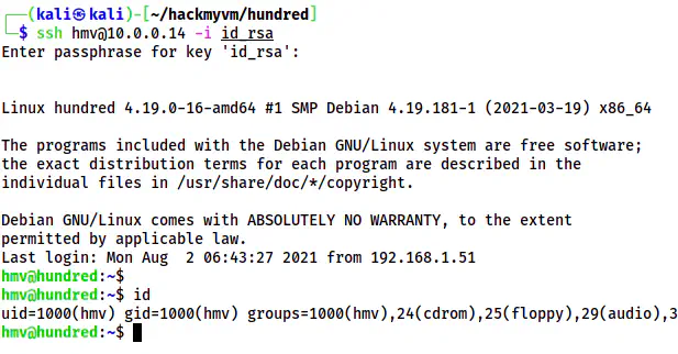 However, when I tried logging in as the user hmv, it asked me for the passphrase. Therefore, I have to find it. As I said earlier, we have a logo.jpg file that we can perform steganography and file information from there. The rockyou.txt didn’t work, but the users.txt file had the passphrase.