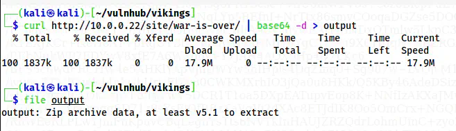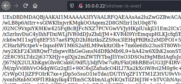 curl http://10.0.0.22/site/war-is-over/ | base64 -d > output