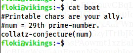 From the file boat, we see that we have to find printable characters from collatz conjecture of a number. This is a very interesting conjecture and its domain is positive numbers. Since this hasn’t been proved or disproved (for all positive numbers), it is an unsolvable problem. Anyway, this works till the number 2 to the power 68. According to the conjecture, for a positive odd number n, we have to perform the next calculation as n = 3n + 1. Similarly, for a positive even number, it should be n = n / 2. Doing this iteration, we will reach number 1 and we can stop.