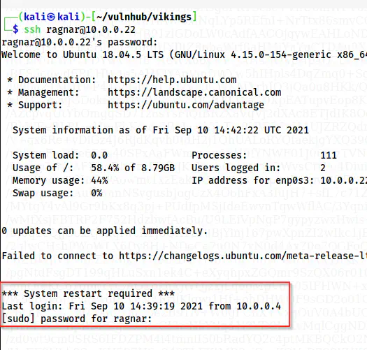 Finally, I could log into the shell of the user ragnar. Also, note here that it asks password as a part of sudo access.