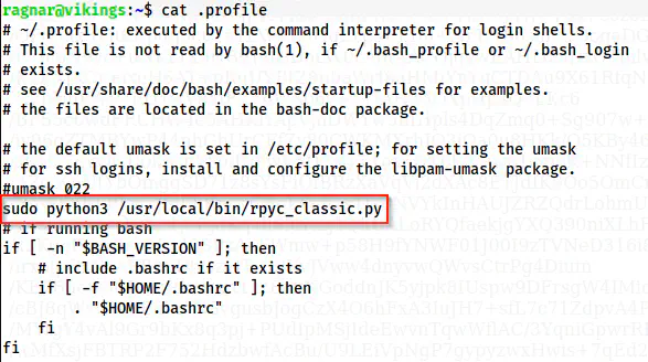 Earlier, we saw that the shell prompt for the password. This happens when commands are stored in user profiles, i.e. .profile, .bashrc, .bash_profile, /etc/profile, etc. Hence, I checked the file .profile and found a command.