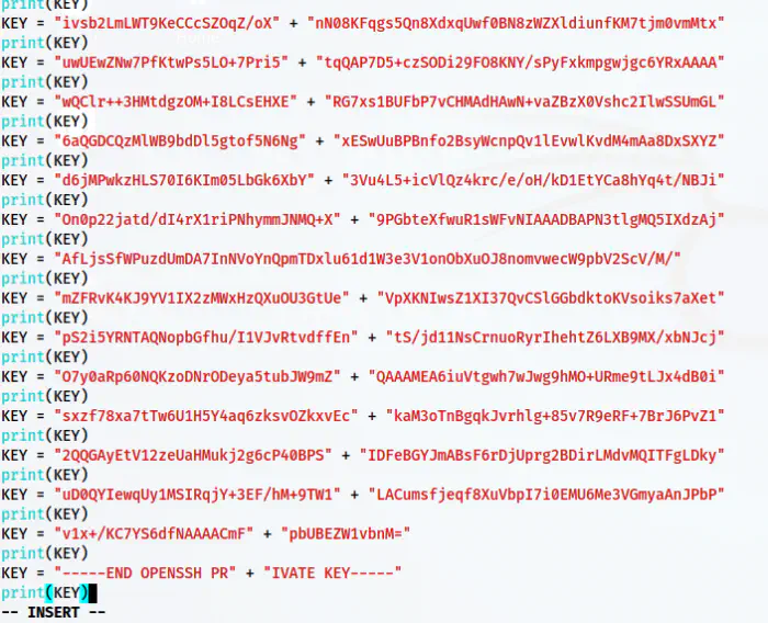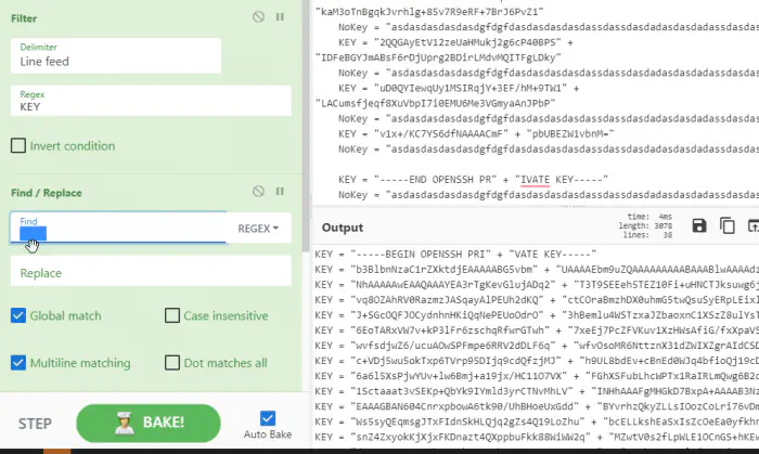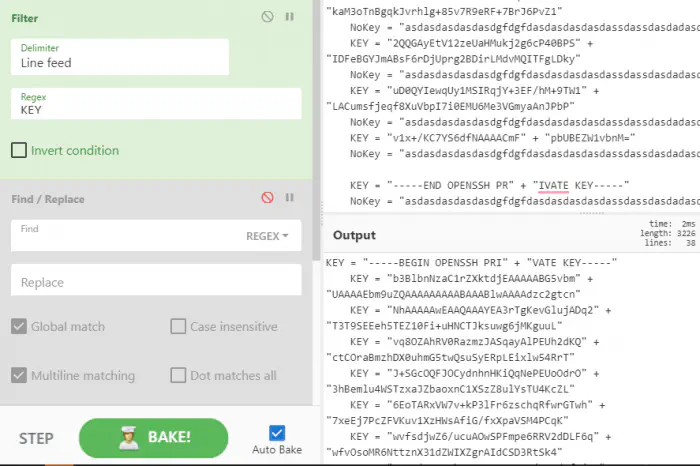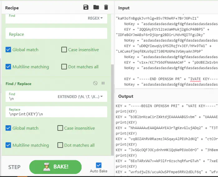 Here, we can see an SSH private key split in a piece of code. But, we have to clean this code by selecting KEY values only. You can manually copy these lines and format them in python language. However, I will be using CyberChef for this. Firstly, I will filter out the NoKey part. Then, I will remove the initial few whitespaces using Find/Replace method. Next, I will replace the line feed with python’s print statements.