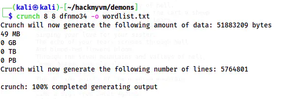 Now, let’s look at the problems with the binary crunch too. It does the permutations and generates the wordlist. Thus, we will also see “aaaaaaaa” in the wordlist. We can assume that all of the letters are used. Furthermore, upon closely observing the letters, I could see the word “demon” in the format “d3mon”. Thus, I only generated a wordlist that contains d3mon.