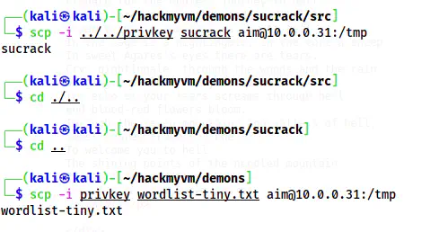 scp -i privkey wordlist-tiny.txt aim@10.0.0.31:/tmp