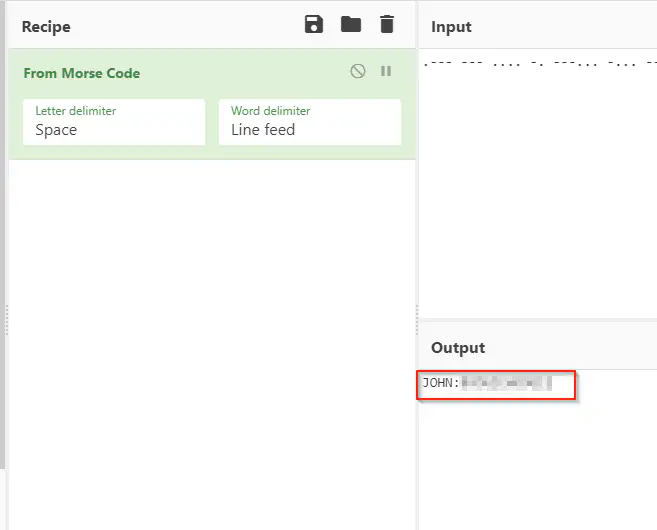 Finally, we get our first credentials to our SSH server. Obviously, we might have to use lowercase as Morse code only has uppercase letters.