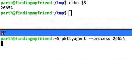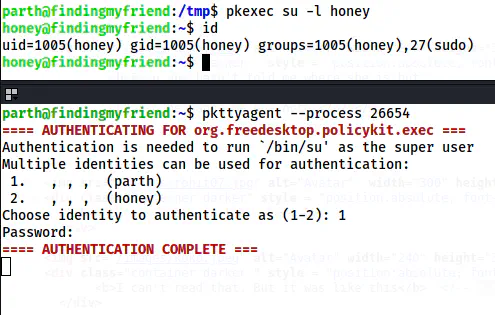 This is all for getting the root shell. However, let’s get to the user honey first. pkexec is similar to sudo except that we can also use it for GUI authentication. All the authentication popups like that we see below are invoked by pkexec. However, this also works on the command line.