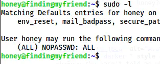 The sudo permissions of the user honey