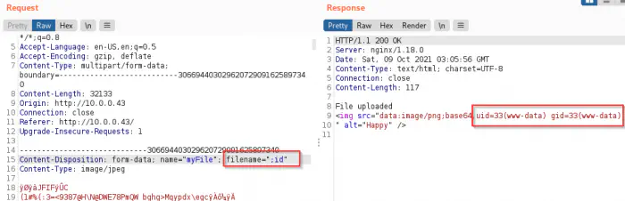 I tried various techniques of which the following one worked. In this technique, we have to use commands as filenames. Therefore, I opened the burp suite repeater to change the filename during upload.