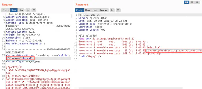 Finally, I got the command execution using the filename field. Moreover, we might not be able to inject shellcode because the filesystem might not allow illegal filenames. Anyway, when I listed the files on the directory using “;ls -al”, I found a file that contained the username and the password.