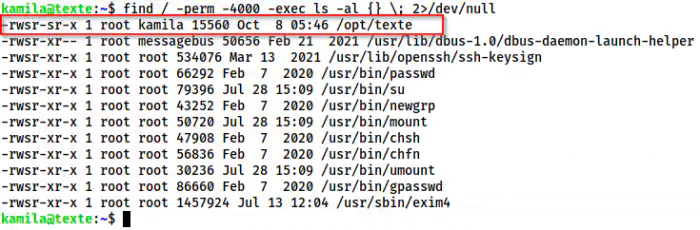 find / -perm -4000 -exec ls -al {} \; 2>/dev/null