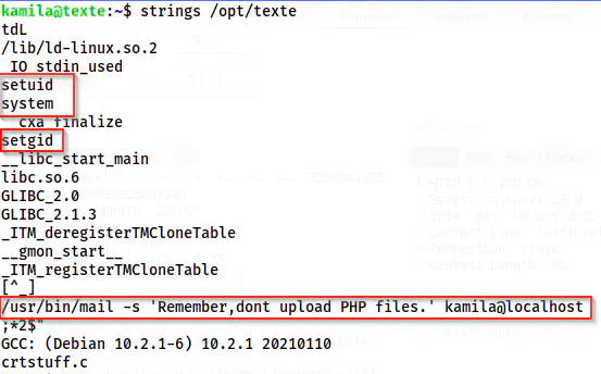 We have a SUID binary “texte” inside /opt directory. Thus, I checked the strings of it.