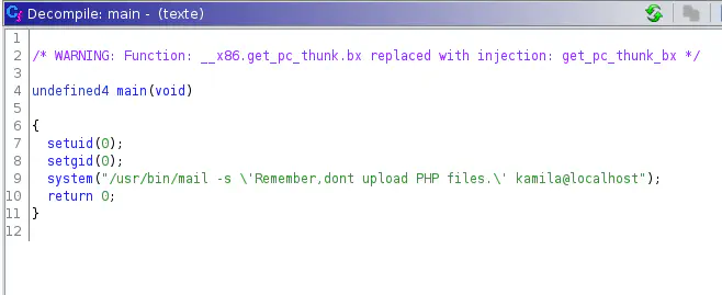 My experience with the CTF machines gave me a fair picture of the underlying source code. However, to show you how it looks like, I will reverse engineer this with Ghidra.