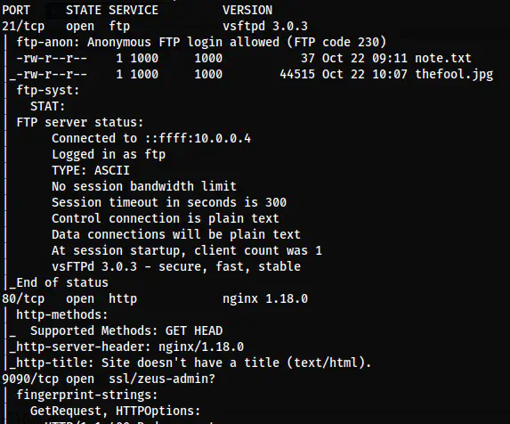 Here, we can see that only ports 21, 80 and 9090 are open and there isn’t an SSH port. Hence, we get an idea that we might be spawning a reverse shell or finding an SSH port. Likewise, there is anonymous access allowed to port 21.