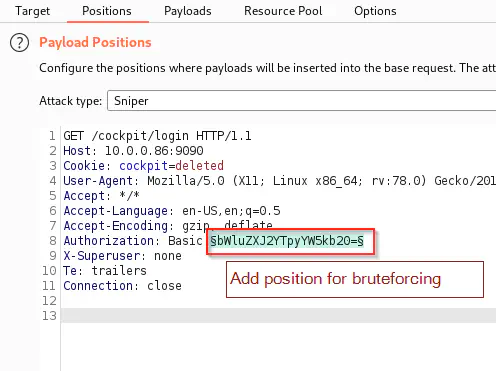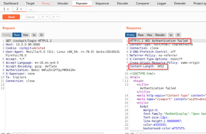 The Cockpit CMS running at port 9090 uses basic authentication. This is a simple form of authentication where usernames and passwords are encoded in base64 format and sent in Authorization header as “Basic: ”. Let’s check that in the burp suite.