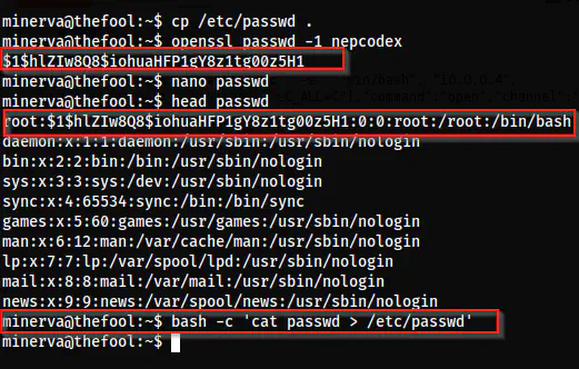 Luckily, we have the capability cap_dac_override set on the binary bash. This capability allows to read, write and execute files as the current user irrespective of their permissions. This means that we can overwrite passwd file with our password for root. So, I made a copy of the /etc/passwd file and added my password hash for the root user.
