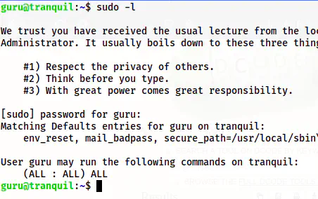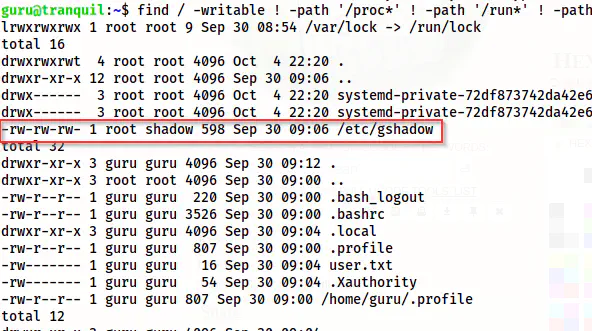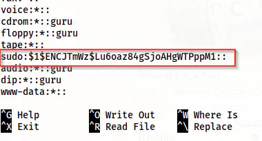 From the screenshot above, we can see that anyone can write on /etc/gshadow. Like /etc/shadow, /etc/gshadow stores the hashes of the group. For example, if we want to add a user to a group using ’newgrp’, we will be prompted with the password stored in this file for the group. Thus, we can add the user guru to a sudo group and then check his sudo permissions.