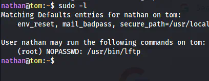 Similarly, I checked the sudo permissions of the user. Then, I found that we can use lftp as the root user.