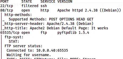 Here, we can see that a filtered SSH port. Similarly, the FTP service is running at port 65535. Lastly, we have an HTTP port.