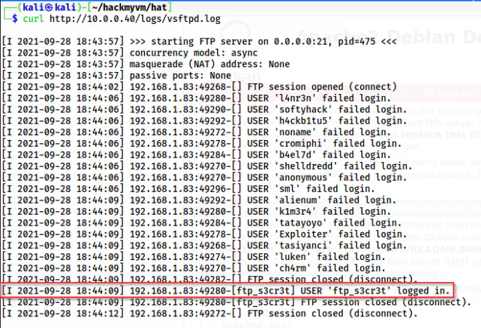 From the log file, I got a possible username for FTP since it had logged in. To get the password, I simply bruteforced using rockyou.txt.