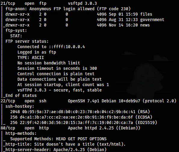 There are many ports open but only FTP, SSH and HTTP ports are our points of interest.