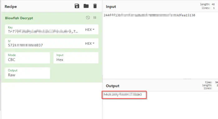 Here, we found three pieces of information required in Blowfish and Triple DES Encryption that was mentioned from a file in the FTP server. Thus, I opened CyberChef to decrypt the password.