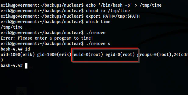 It looked like the binary is running another binary “time” without using its absolute path. This gives us an opportunity to exploit by exporting custom “time” binary and giving it EUID of the root.