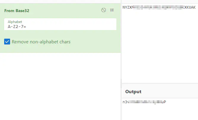 Here, we see a totp field that is a base32. You can test this using “cipher-identifier” of dcode.fr. I decoded the 32 Bit data using cyber chef.