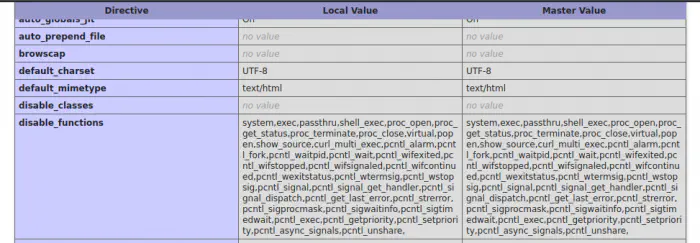 This cursory scan exposed the presence of a PHP info file. In that file, we see that some functions are disabled.